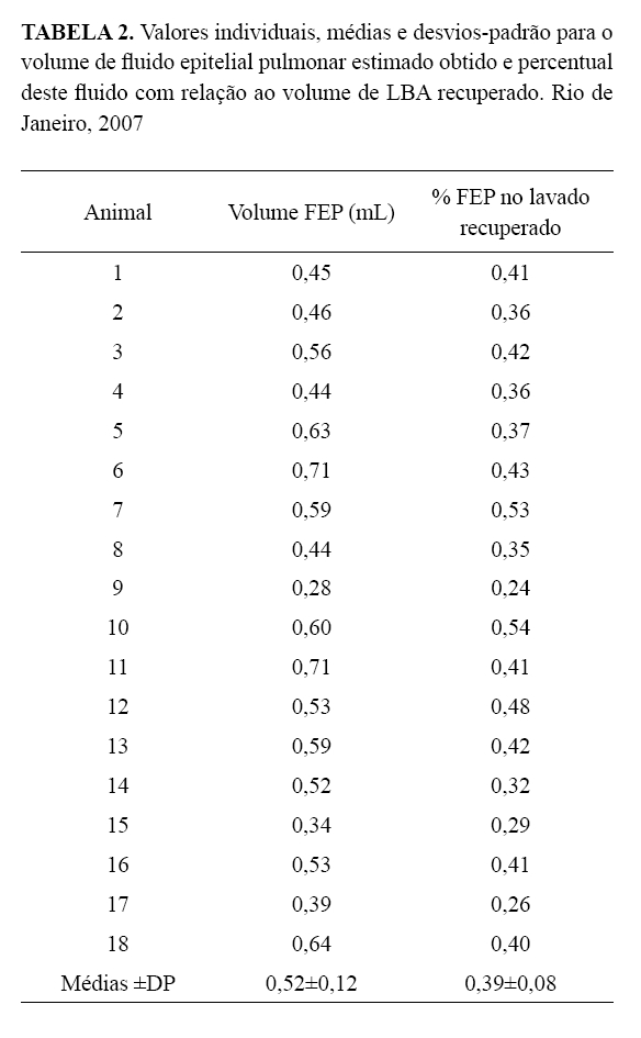 LBA. O volume estimado de FEP teve média de 0,52±0,12mL. O percentual