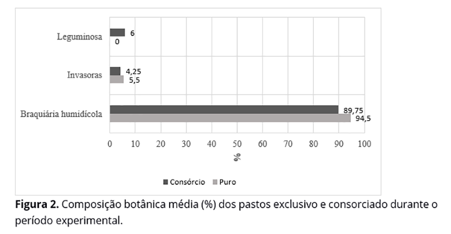 No pasto exclusivo, a participação de B. humidicola foi ligeiramente maior (5,29%) que no pasto consorciado, entretanto, a presença de plantas invasoras foi 29,41% maior em relação ao pasto consorciado (Figura 2). A presença da leguminosa no pasto consorciado pode ter inibido o crescimento de plantas invasoras, reduzindo sua participação na composição botânica.