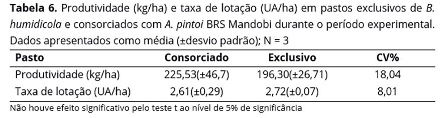 Na Tabela 6 encontram-se as médias de produtividade e taxa de lotação dos pastos, que também não apresentaram diferença (P>0,05). Embora sem significância estatística, os animais do pasto consorciado apresentaram um aumento de 14,9% na produtividade em relação àqueles mantidos nos pastos exclusivos. A capacidade de suporte foi semelhante (P>0,05) entre os pastos exclusivos e consorciados (2,61 x 2,72 UA/ha), demonstrando que o efeito da leguminosa se restringiu à melhoria da qualidade da dieta, não interferindo nas taxas de crescimento da gramínea, efeito esperado devido ao maior aporte de nitrogênio.