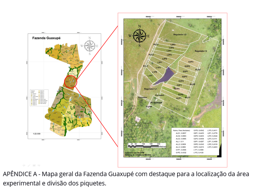 A área experimental foi constituída de 6 módulos com uma área média de 1,431 ha cada, três formados exclusivamente com a Brachiaria humidicola cv. Tully (pasto com mais de 30 anos de estabelecimento, nunca foi adubado) e três com o consórcio dessa gramínea com o Arachis pintoi cv. BRS Mandobi. Cada módulo experimental (repetição de campo) foi divido em três piquetes para a realização do manejo rotacionado do pastejo, com um período de ocupação de sete dias e 14 dias de descanso.