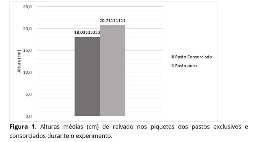 De maneira geral, o pasto exclusivo de B. humidicola manteve-se com maior altura média que o tratamento em consórcio com A. pintoi. Mesmo durante a época seca do ano, o manejo da altura do pasto mostrou-se eficiente, com alturas médias de 18 e 20,7 cm, nos pastos consorciado e exclusivo, respectivamente (Figura 1).