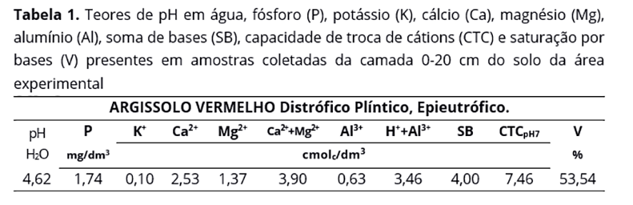O experimento foi realizado no período de 16 de fevereiro de 2016 a 30 de junho de 2016, em propriedade particular de produtor parceiro da Embrapa Acre (Agropecuária Guaxupé - Rodovia AC 90, km 33, Rio Branco, AC), localizada a 9° 57' 52.33" Sul e 68° 6' 4.27" Oeste, com 203 metros de altitude. O solo da região é classificado como ARGISSOLO VERMELHO Distrófico plíntico com caráter epieutrófico(8). A análise química do solo da área experimental foi realizada na camada de 0-20 cm (Tabela 1).