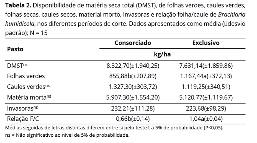 A disponibilidade de folhas verdes do pasto exclusivo foi superior (P<0,05) à do consorciado, apresentando médias de 1,17 t/ha e 0,86 t/ha (±0,078EP) respectivamente. A relação folha/caule foi maior (P<0,05) no pasto exclusivo que no pasto consorciado, o que pode ser explicado pela menor produção de folhas verdes no pasto consorciado (Tabela 2).