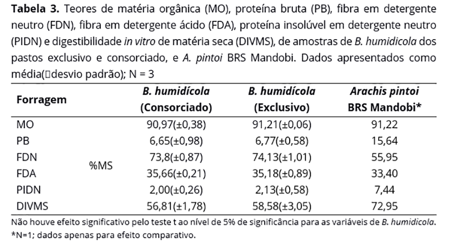 Na Tabela 3 encontram-se os teores médios resultantes da análise bromatológica de B. humidicola do pasto exclusivo e consorciado, e de A. pintoi cv. BRS Mandobi. Em ambos os pastos, a gramínea obteve médias semelhantes (P>0,05) para suas características químicas, com pouca diferença entre consórcio e pasto exclusivo. Destacam-se os teores de PB e DIVMS do amendoim forrageiro, com teores de 15,64% e 72,95% respectivamente.