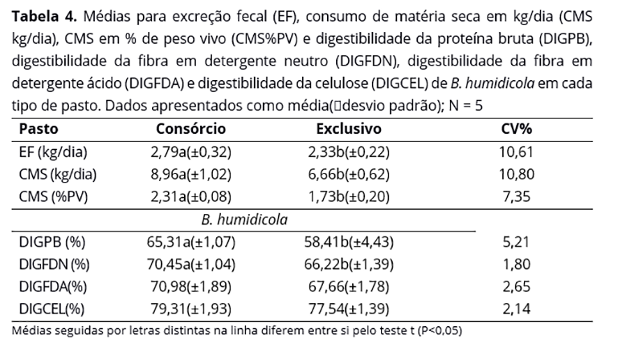 Animais manejados em pastos consorciados apresentam consumo de matéria seca superior àqueles mantidos em pasto exclusivo de B. humidicola.