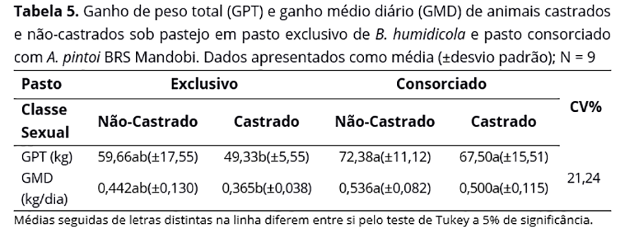 Os animais castrados do pasto consorciado tiveram ganhos de peso 37% superiores (P<0,05) aos castrados do pasto exclusivo (365 g/dia vs. 500 g/dia). Os animais não castrados tiveram desempenho estatisticamente igual em ambos os pastos, mesmo com uma diferença de 21% no desempenho produtivo. Adicionalmente, os animais não castrados do pasto consorciado apresentaram desempenho 46,8% superior aos castrados do pasto exclusivo e os animais castrados do pasto consorciado tiveram 13% a mais de ganho em comparação aos não castrados do pasto exclusivo.