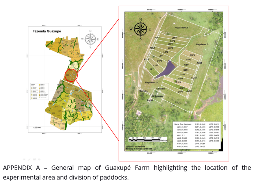 The experimental area consisted of 6 modules with a mean area of 1.431 ha each, three of them formed exclusively with Brachiaria humidicola cv. Tully (pasture with more than 30 years of establishment and never fertilized) and the other three formed with the intercropping between this grass and Arachis pintoi cv. BRS Mandobi. Each experimental module (field replication) was divided into three paddocks for rotational grazing management, with a grazing period of seven days and 14 days of resting.