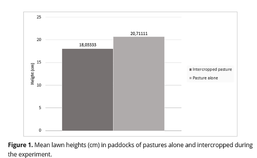 In general, the pasture with B. humidicola alone remained at a higher mean height than that intercropped with A. pintoi. Even during the dry season, pasture height management was efficient, with mean heights of 20.7 and 18 cm in the pasture alone and intercropped, respectively (Figure 1).