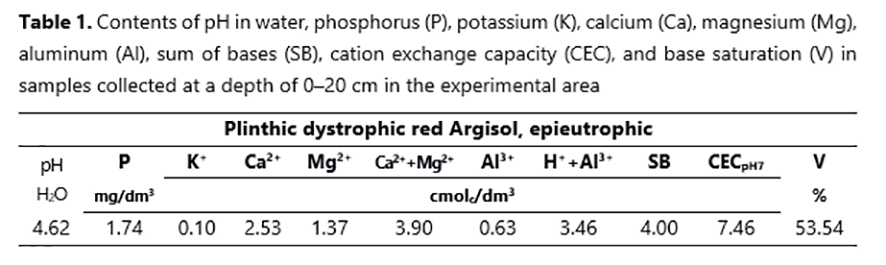 The experiment was conducted from February 16, 2016, to June 30, 2016, on the private property of a partner producer of Embrapa Acre (Agropecuária Guaxupé, Rodovia AC 90 km 33, Rio Branco, AC), located at 9°57′52.33″ S and 68°6′4.27″ W, with 203 m of altitude. The soil of the region is classified as a plinthic dystrophic red Argisol of epieutrophic character(8). Soil chemical analysis of the experimental area was performed at a depth of 0–20 cm (Table 1).
