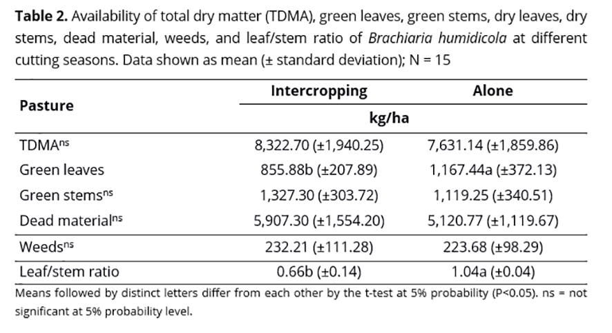 Green leaf availability in the pasture alone was higher (P<0.05) than the intercropped pasture, with means of 1.17 and 0.86 t/ha (±0.078 SD), respectively. The leaf/stem ratio was higher (P<0.05) in the pasture alone than in that intercropped, which may be explained by the low production of green leaves in the intercropped pasture (Table 2).