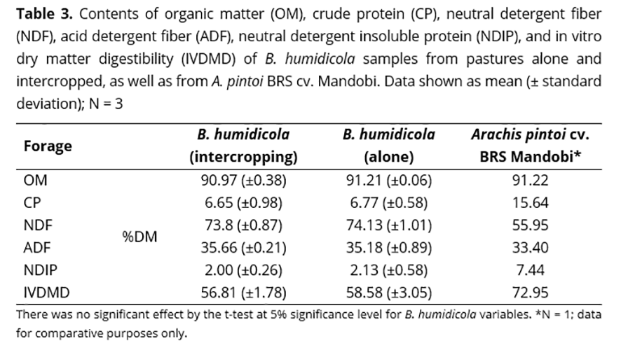 Table 3 shows the mean contents resulting from the bromatological analysis of B. humidicola from pasture alone and intercropped, as well as from A. pintoi cv. BRS Mandobi. In both pastures, the grass presented similar means (P>0.05) for its chemical characteristics, with little difference between intercropping and pasture alone. CP and IVDMD contents of forage peanut stood out, with contents of 15.64 and 72.95%, respectively.