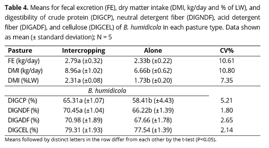 Animals managed on intercropped pastures have higher dry matter intake than those kept on pastures of B. humidicola alone.