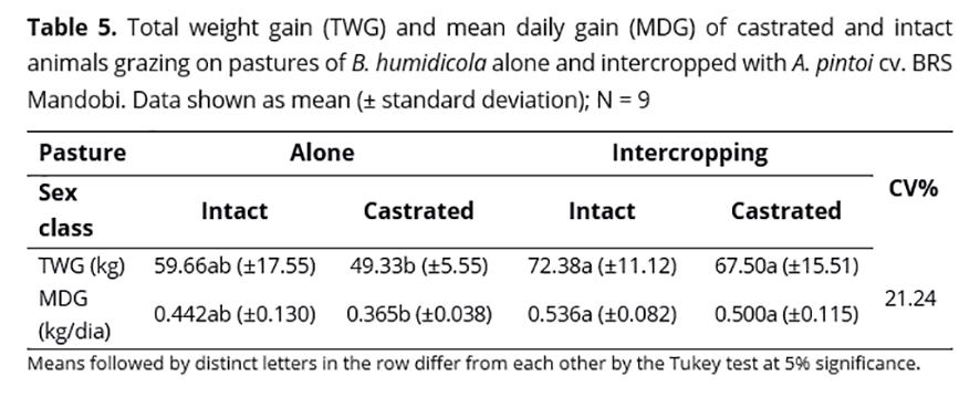 Castrated animals from the intercropped pasture had 37% higher weight gains (P<0.05) than those from pasture alone (365 and 500 g/day, respectively). Intact animals showed statistically equal performance in both pastures, even with a 21% difference in the productive performance. Also, intact animals from the intercropped pasture presented a performance 46.8% higher than those castrated from pasture alone, while castrated animals from the intercropped pasture showed a 13% higher gain than those intact from pasture alone.