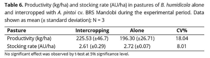 Table 6 shows the mean productivity and stocking rate of pastures, which showed no difference (P>0.05). Although without statistical significance, animals from the intercropped pasture had a 14.9% increase in productivity compared to those kept in pastures alone. Carrying capacity was similar (P>0.05) between pastures alone and intercropped (2.61 and 2.72 AU/ha, respectively), showing that the legume effect was restricted to the improvement of diet quality, not interfering with grass growth rates, an expected effect due to the high nitrogen contribution.