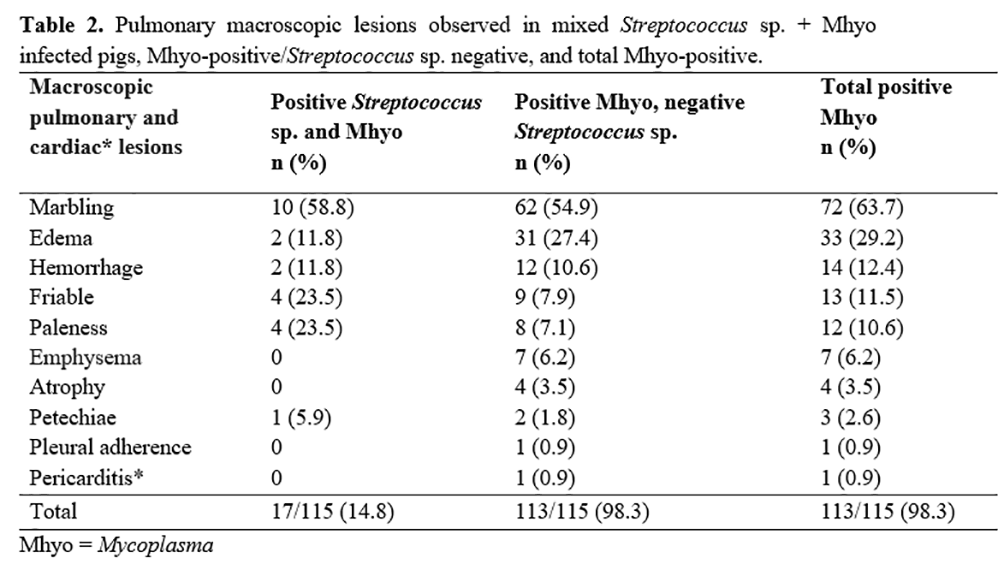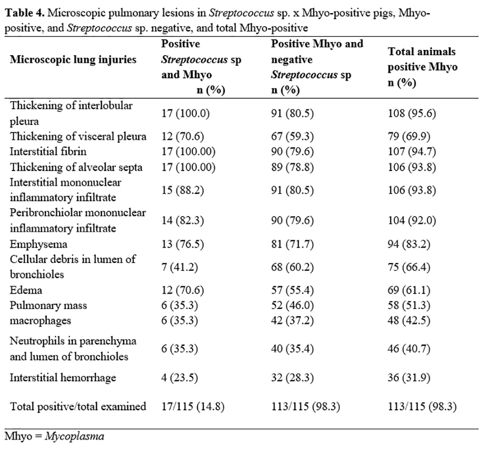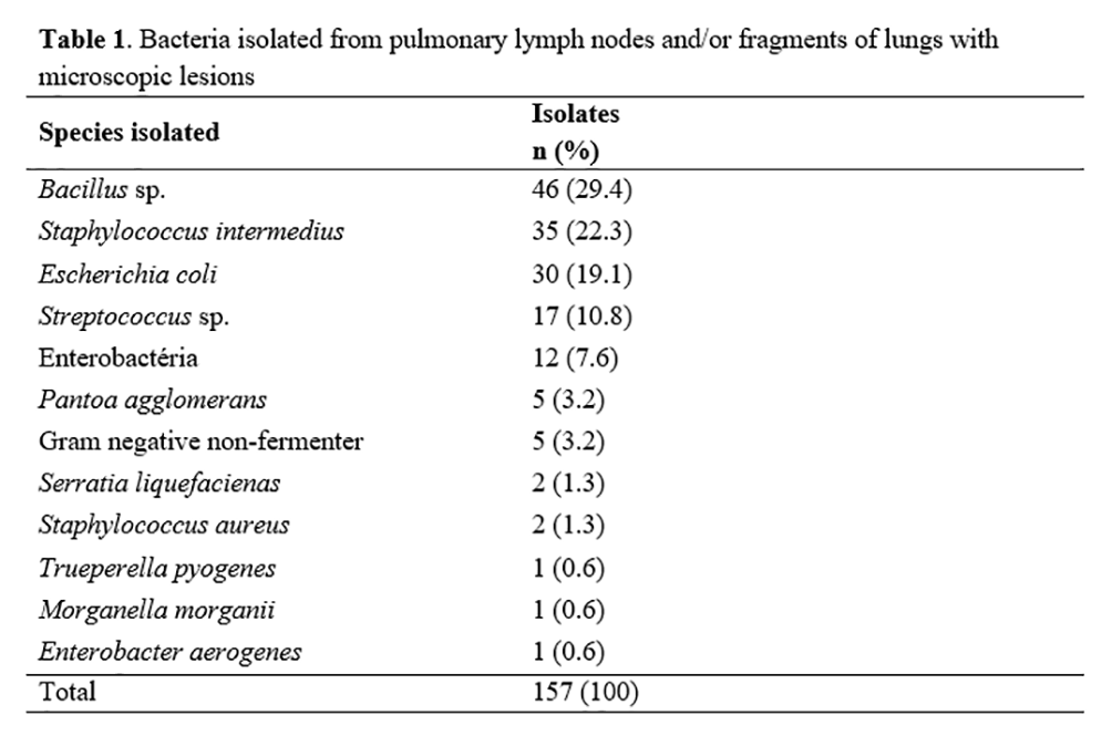At slaughter, samples of whole blood, lung fragments, and mediastinal lymph nodes were collected from 115 pigs. Fragments of lung and mediastinal lymph nodes with macroscopic lesions were divided, with a portion kept refrigerated for bacterial isolation and another fixed in 10% buffered formalin for histology.