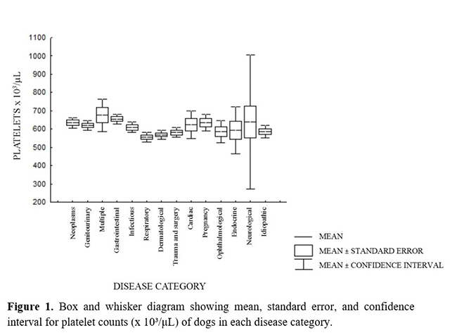 The reference range of platelet count in dogs was as given by Schalm et al.(2). The collected data was analyzed using descriptive statistics, and the Kruskal-Wallis test at 5% significance (P ≤ 0.05) in the R Project 3.4.3 software was performed(13).