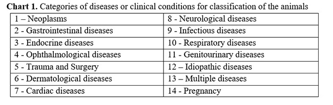 Each dog was assigned to one of the following disease or clinical condition categories according to the diagnosis (Chart 1): neoplasms; gastrointestinal, endocrine, or ophthalmological diseases; trauma and surgery; dermatological, cardiac, neurological, infectious, respiratory, genitourinary, idiopathic (when thrombocytosis had no underlying diseases or processes), or multiple (with more than one disease or condition involved) diseases; and pregnancy.