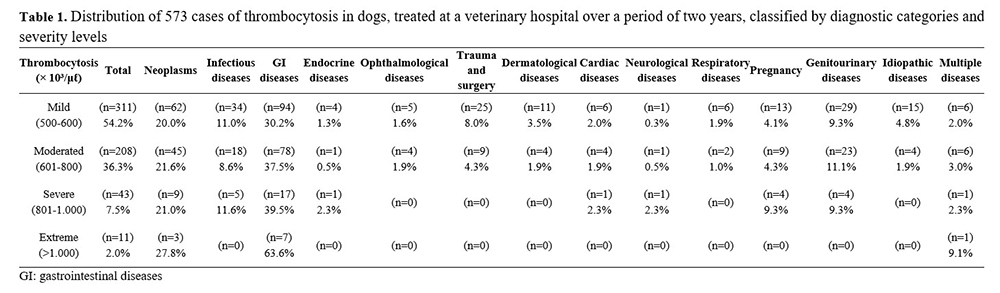 Increased platelet count could be quite severe under reactive conditions (>1,000,000/μL)(2). When classified by severity, 311 (54.2%) dogs presented mild thrombocytosis, 208 (36.3%) moderate thrombocytosis, 43 (7.5%) severe thrombocytosis, and 11 (2.0%) extreme thrombocytosis (Table 1).