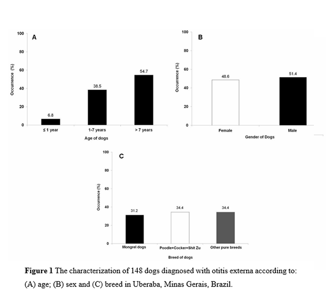 In the present study, there was a higher number of inflammatory processes in the ears of dogs over seven years old, suggesting that age may influence the occurrence of OE. This apparent predisposition may be associated with endocrine diseases or immune mediated disorders in older dogs(2,11).