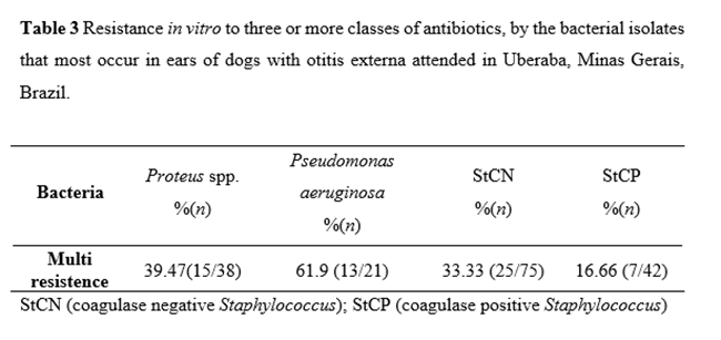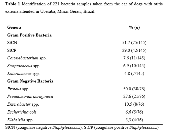 Lesions in the epithelium of the ear canal can create a suitable environment for excessive multiplication of microbes, resident or transient, leading to inflammation(13). In canine OE, the identification of Gram-positive bacteria is more often found than Gram-negative(13), with bacteria of the genus Staphylococcus spp. the most commonly isolated(2,4,12,14). Positive coagulase Staphylococcus (StCP) is the most frequent inflammation of the canine ear canal(13,14). However, in this study coagulase negative Staphylococcus (StCN) was the most more frequently found, corroborating other studies(4,15).