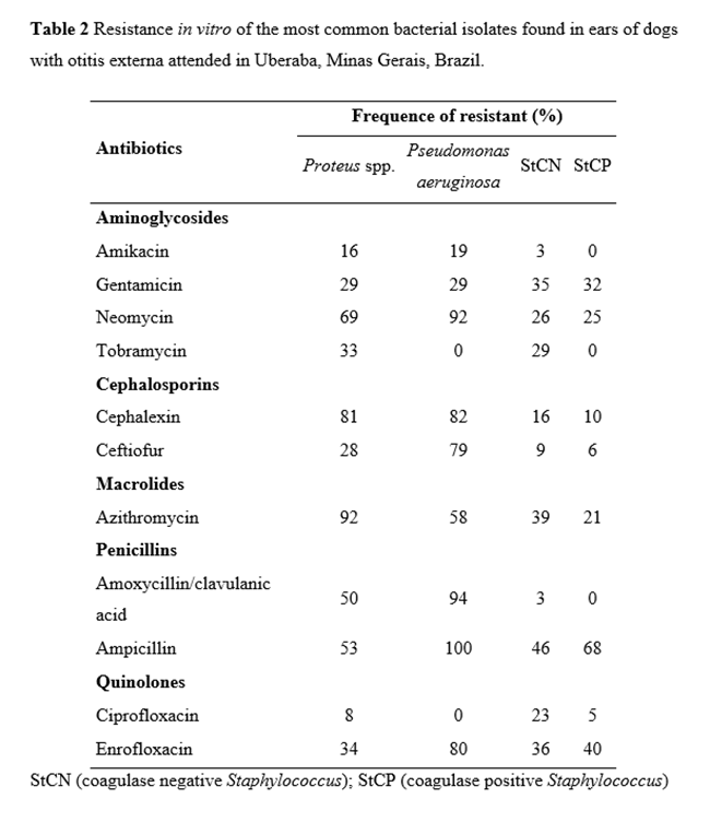 Microbiology laboratories should periodically and systematically conduct etiological identification and antimicrobial susceptibility testing to help ensure appropriate treatment and monitor the epidemiological profiles of isolated bacteria(3). Positive coagulase Staphylococcus (StCP) and Pseudomonas aeruginosa are bacteria often isolated in canine otitis externa(4).