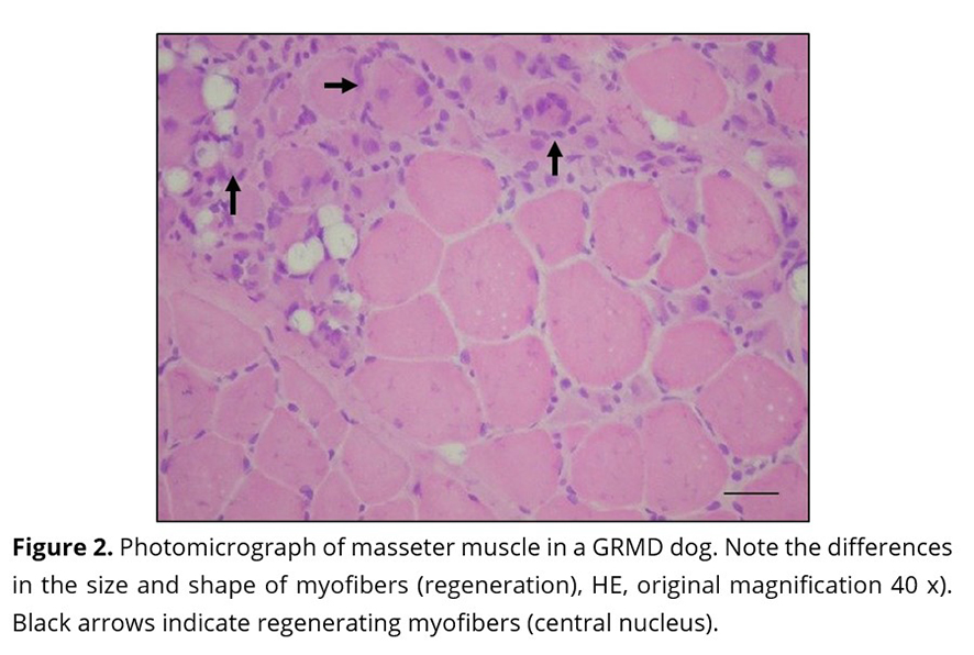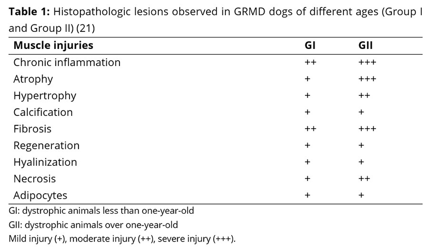 Golden Retriever Muscular Dystrophy (GRMD) was recognized in the 1970s and 1980s. GRMD has phenotypic characteristics similar to those in people affected by Duchenne Muscular Dystrophy (DMD)(2). GRMD dogs have the corresponding spontaneous mutation in the same gene as human patients(2).