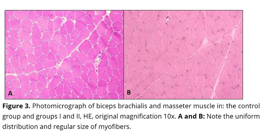 In the control samples, no morphologic or degenerative lesions were described. The samples consisted of cylindrical myofibers and peripheral nuclei. Additionally, the myofibers showed uniform distribution and regular size (Figure 3).