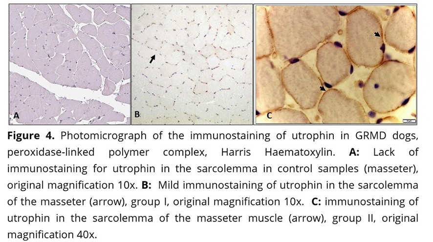 Utrophin is a muscle protein that interacts with the same cytoskeletal proteins (dystrophin) but binds to different sites on the actin filament(6). This suggests that utrophin and dystrophin may act similarly inside the cell. In healthy animals, utrophin can be expressed at the neuromuscular junction (NMJ), tendon muscle, in vessels and nerves, as well as participating in muscle formation and regeneration(6, 7). In mdx mice, utrophin compensates for the lack of dystrophin, maintaining the interaction between the actin cytoskeleton and the dystrophin-glycoprotein complex on the sarcolemma. Positive anti-utrophin antibody immunostaining shows variable intensity in dystrophic skeletal muscles(6).