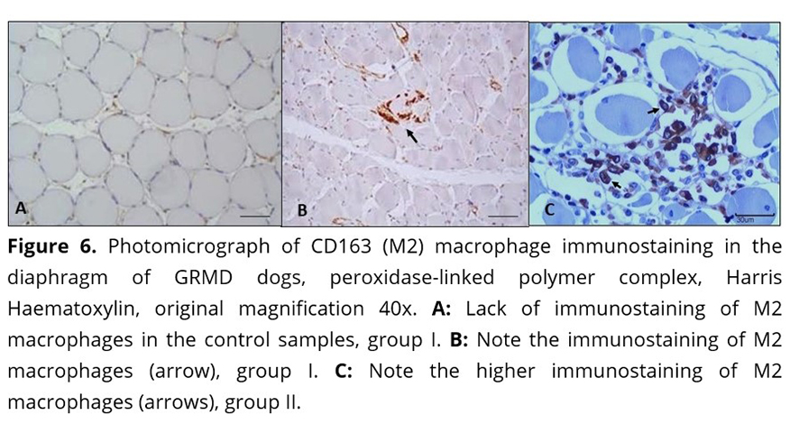 The immunostaining of M2 macrophages in the two groups of dystrophic animals ranged from moderate to severe in all evaluated muscles. The M2 subtype expressed by CD163 in skeletal muscles of dogs of this study was seen in areas where there was endomysial fibrosis, especially in the diaphragm (Figure 6 B and C) as shown in Table 5. In this muscle, there were twice as many M2 macrophages as M1 macrophages.