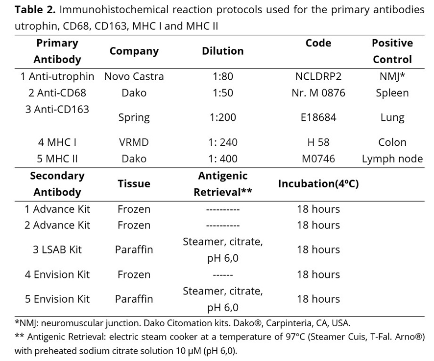 The immunohistochemical method used was the streptoavidin-biotin-peroxidase complex(22). Five primary antibodies were used to evaluate immunostaining of M1 macrophages (CD68), M2 macrophages (CD163), MHC I, MHC II, utrophin, as shown in Table 2.