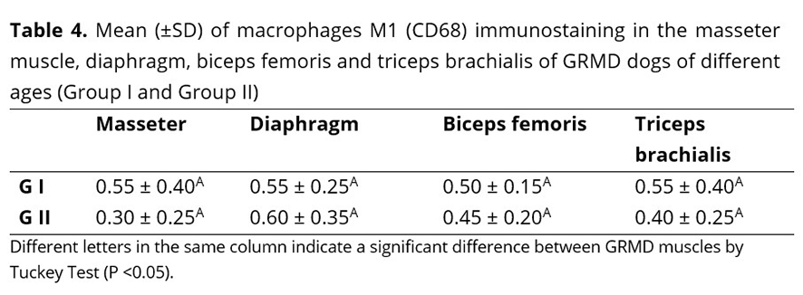There was no significant difference (P <0.05) in histopathologic lesions in the masseter, diaphragm, triceps brachialis and femoral biceps muscles of dogs affected by muscular dystrophy, indicating that age does not affect the severity of histopathologic lesions described in GRMD dogs(21).