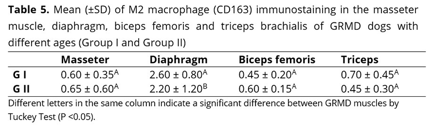 In conclusion, our findings support the hypothesis that M2 macrophages are the main mononuclear inflammatory cells present in lesions in GRMD dogs. The immunostaining of M2 macrophages suggested that in GRMD dogs over one year of age, this macrophage subtype increases in number in the diaphragm. Although this occurred only in the diaphragm muscle sample in this study, we can assume that the same would be true for the other muscles used in this study. This suggests that macrophages are involved in development of chronic muscular lesions of dystrophic dogs.