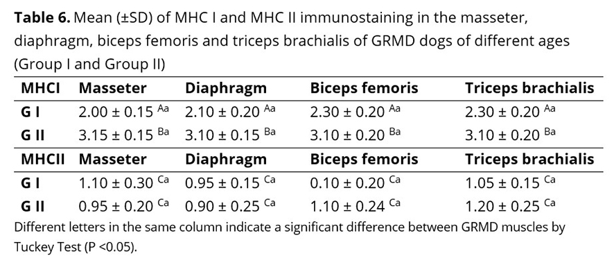 MHC II immunostaining occurred in groups of mononuclear inflammatory cells, especially macrophages, concentrated in areas of degeneration and necrosis, thus confirming their participation in GRMD (Figure 6 E and F). There was no significant difference in MCH II expression in the four muscles evaluated, between the two groups of dystrophic animals, showing that the expression of MHC II did not vary with the age of the dystrophic animal (Table 6).