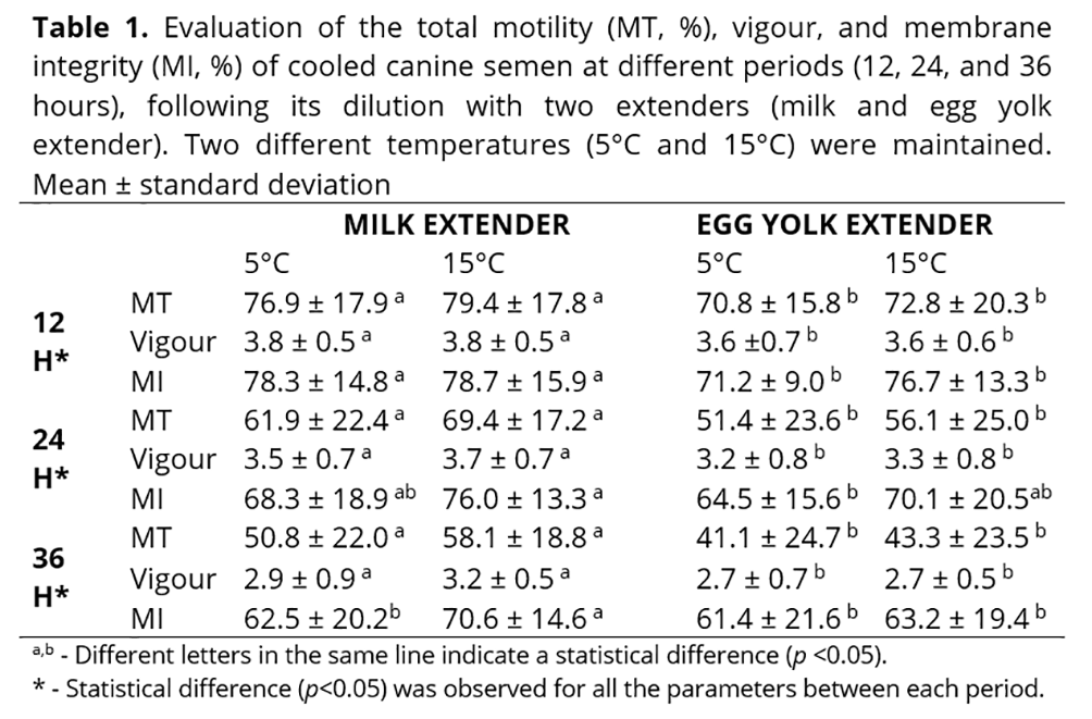 Canine spermatozoa require exogenous substrates to preserve intracellular energy reserves and support motility. The consumption of glycolysable sugars can provide energy through mitochondrial oxidative phosphorylation and glycolysis(17). Ponglowhapan et al.(17) showed that 20% of egg yolk in a distilled water mixture contains 3–4 mM of glucose, but the addition of a higher concentration (70 mM) of glucose in an egg yolk extender better preserved the sperm motility and movement patterns than a control extender containing only egg yolk. Therefore, the presence of glucose may also explain the higher motility maintained in the semen diluted with the milk extender that was observed in this study.