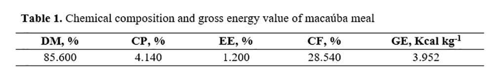 Macaúba meal was obtained by cold pressing the pulp to extract the oil and then drying the cake. Chemical composition and gross energy value of macaúba meal used in the formulation of experimental diets are shown in Table 1.