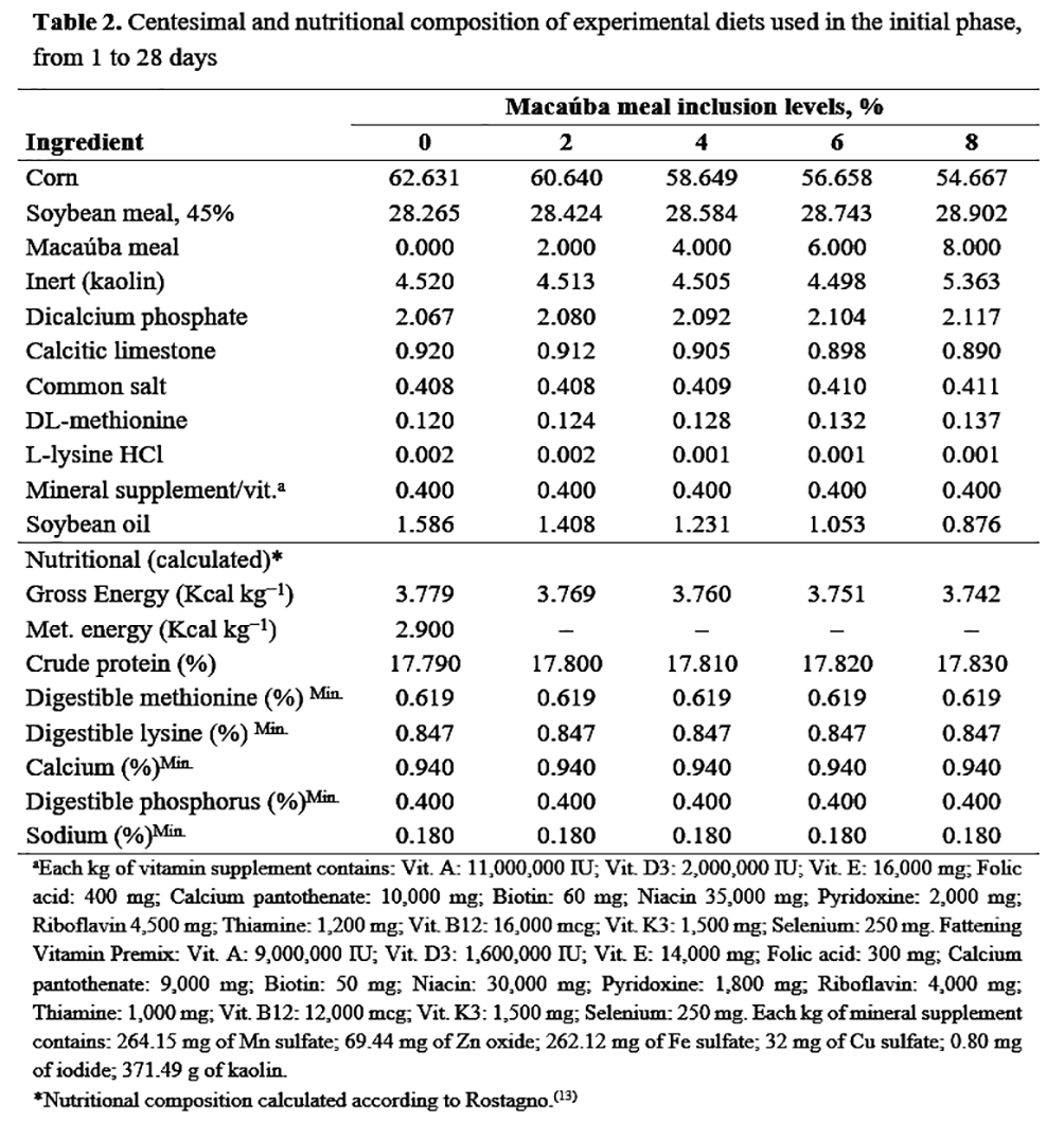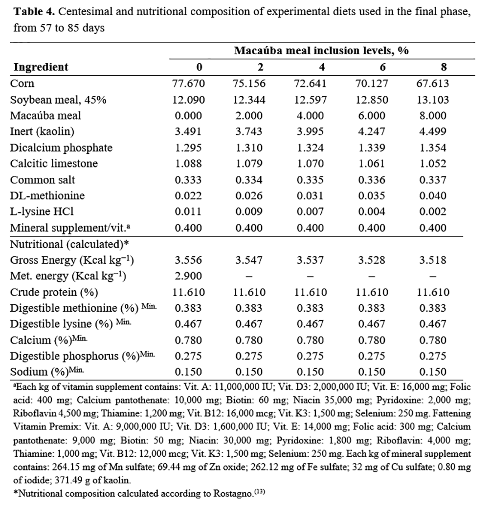 Experimental diets were formulated to meet the nutritional requirements of animals according to the linage manual(12) and growth phase, and each of them contained one of the following five macaúba meal levels: 0, 2, 4, 6, and 8% (Tables 2, 3, and 4).