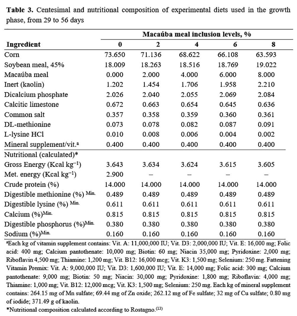 Therefore, this study was carried out to evaluate macaúba meal levels in the diet of colonial broilers in performance and carcass characteristics.