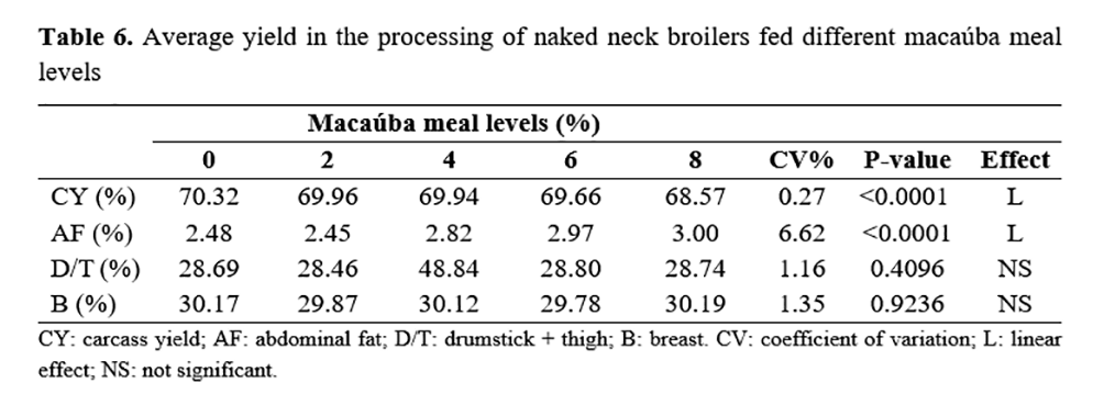 Breast and drumstick + thigh yields were not influenced (P>0.05) by macaúba meal levels.