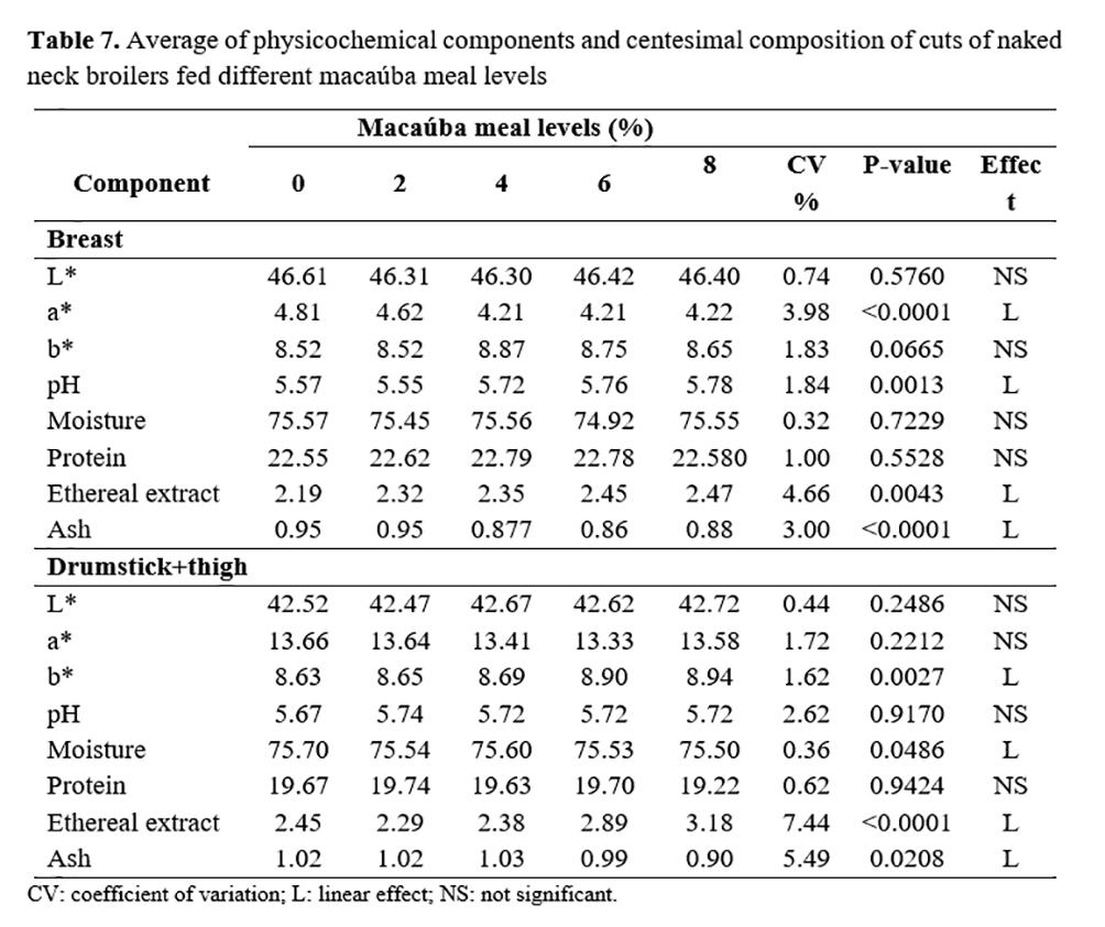 Luminosity (L*) of breast and drumstick + thigh was not influenced (P>0.05) by the inclusion of macaúba meal in the animal feeding (Table 7).