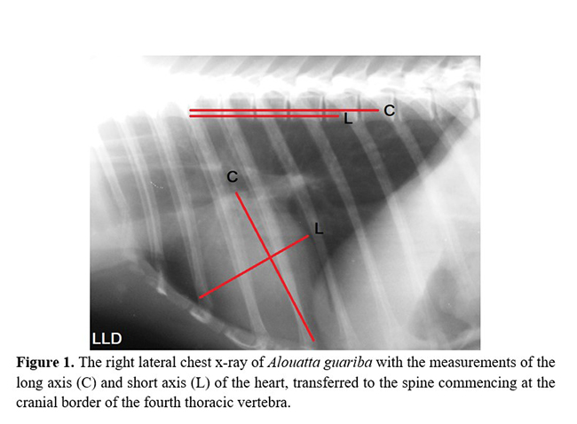 To enable the assessment of the cardiac silhouette, the VHS method (vertebral heart size) was created. This is a quantitative measurement that predicts the condition of the heart through the performance of latero-lateral radiographs utilizing the vertebral unit system. Thus, the lengths of the thoracic vertebrae are compared with the measurements drawn from the cardiac silhouette. In some domestic animals, like dogs, for instance, these values have already been established prior(1). However, in general, for wild animals including HNP, such data are scarce in the literature.