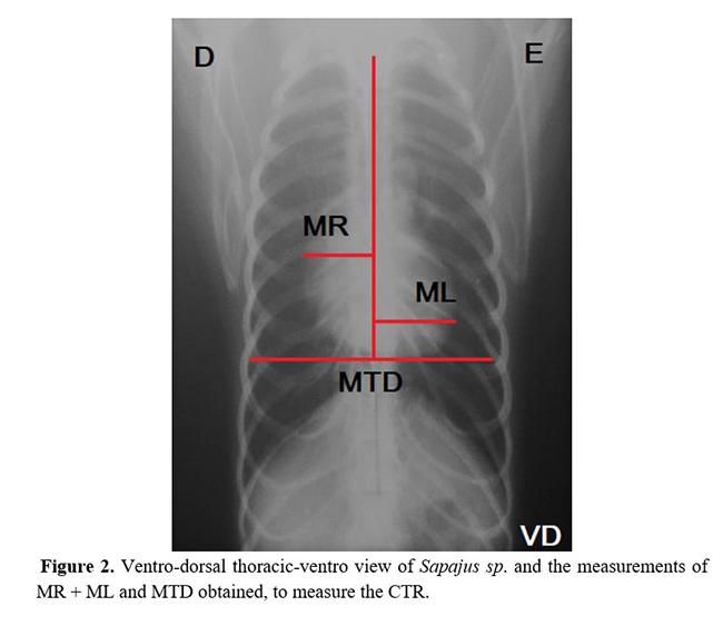 Using the methodology of Schillaci(7) heart size (CTR) was assessed by comparing the heart widths; these measurements were taken from the vertical line (spinal processes of the thoracic vertebrae) to the right side (MR) and left side (ML) at its largest diameter point, while the thoracic diameter was measured at the height of the eighth rib pair. The CTR measurement was based on the sum of the MR and ML by thoracic diameter (MTD)(7), that is, CTR = MR + ML / MTD, as shown in Figure 2. It is significant that this measurement was done solely for the animals of the genus Sapajus sp.
