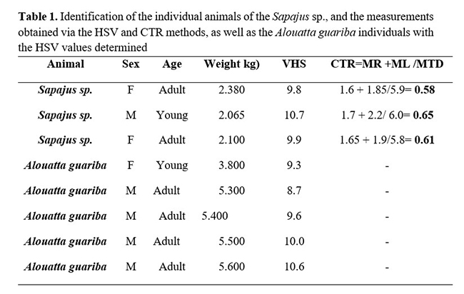 Another conclusion drawn was that the animals of the Sapajus sp. expressed a proportionally larger size of the cardiac silhouette than did those of the Alouatta guariba species, in which they heavier and larger sized and the HSV is proportionally lower.