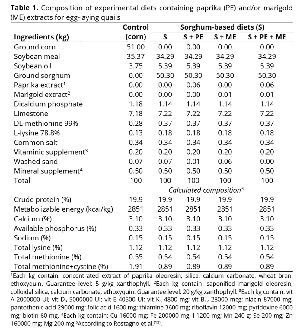 The commercial products Sun Gold SG-20® and Sun Red S-50® (Seifun Comércio e Indústria Ltda, São Paulo, Brazil) contained marigold (ME) (Tagetes erecta) and paprika (PE) (Capsicum annum) extracts as sources of natural yellow and red pigments, respectively. Experimental rations were formulated according to the nutritional requirements of quails as recommended by Rostagno et al.(12) (Table 1). Diets were formulated based on 1- corn (control) and 2- sorghum (S) without pigments, 3- S + 0.06% PE, 4- S + 0.01% ME, 5- S + 0.06% PE and 0.01% ME.