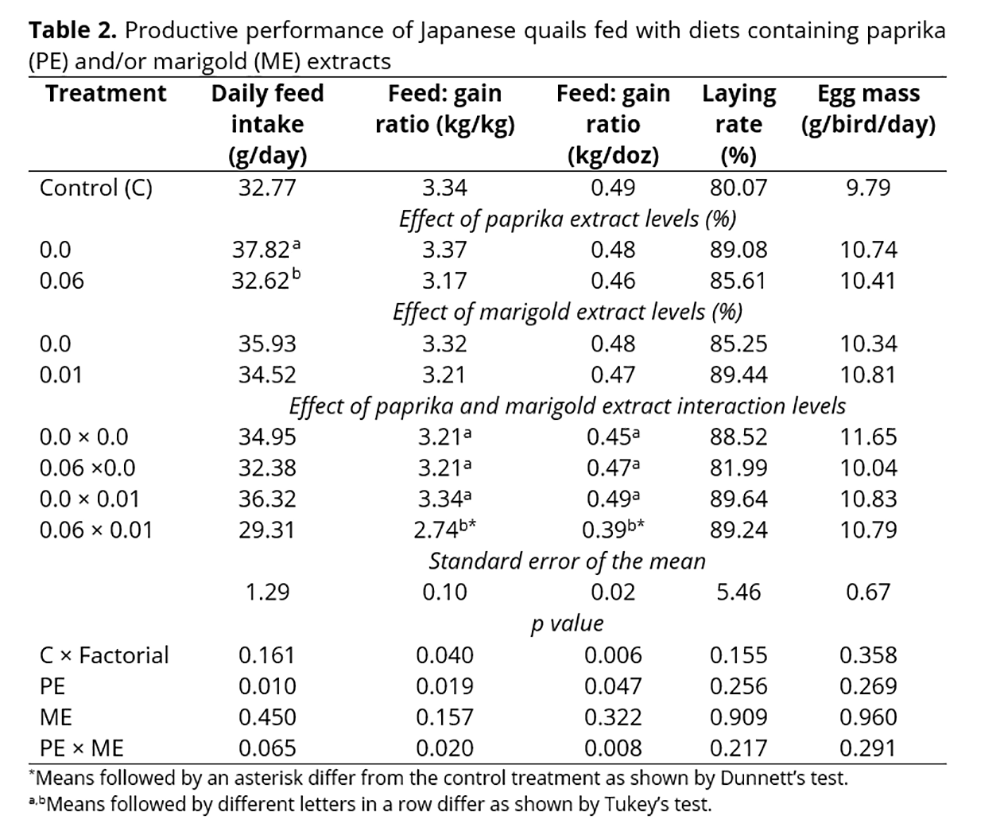 At the doses tested, paprika and marigold extracts could be included in quail diets owing to the improvement in feed: gain ratio and yolk color.