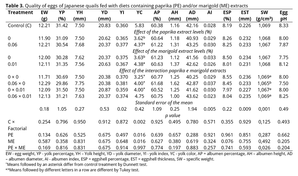 Moura et al.(2) evaluated the inclusion of paprika and/or marigold extracts in diets of quails and observed that yolk color was similar to that obtained using corn-based diets. By studying the effects of marigold extract at 0, 150, 250, and 350 mg/kg included in diets of hens, Skrivan et al.(11) noted that the marigold extract did not affect feed intake; however, the extract at 150 mg/kg improved egg production and egg mass, although it reduced egg weight.