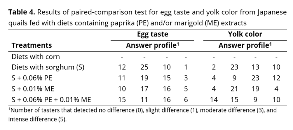 This study was conducted to evaluate the effects of paprika and marigold extracts on the productivity of Japanese quails, quality and sensorial analysis of eggs. Japanese quails were allocated in a completely randomized design and factorial arrangement 2 × 2 + 1, and four replicates. Diets were formulated based on: 1) corn (control), and 2) sorghum (S) without pigments, 3) S + 0.06% paprika extract (PE), 4) S + 0.01% marigold extract (ME), and 5) S + 0.06% PE and 0.01% ME. There was no effect of the control and factorial interaction on feed intake, egg-laying rate, or egg mass; however, the feed: gain ratio was lower among quail fed with diets containing both extracts. The inclusion of PE and ME in the diets improved the feed: gain ratio and yolk color; the inclusion of PE reduced the feed intake and specific weight of the eggs. Compared to the control, treatments based on sorghum or sorghum + PE led to a difference in egg taste and yolk color in the sensorial analysis. It was concluded that paprika and marigold extracts could be included in quail diets because of improvements in feed: gain ratio and yolk color.
