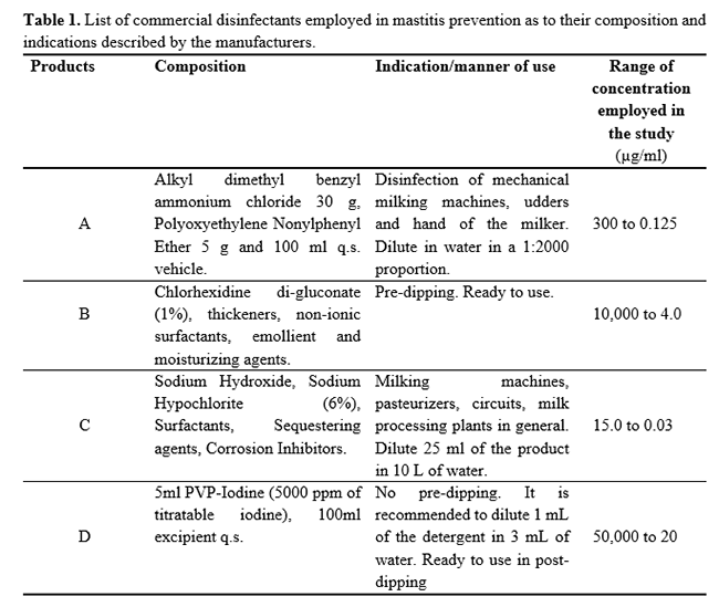 One of the factors that might explain the high activity of the commercial Disinfectants on mastitis-causing bacteria in goats is the little use of these antimicrobial agents in the milking environment of small properties in the state of Pernambuco. Questionnaires administered to dairy goat producers in the outback of the Pernambuco and Bahia states verify the non-utilization of disinfectants before and after milking management(10). Furthermore, the controlled conditions of the study provide a lower interference of organic contaminants, an important factor for the obtainment of the results in this study.