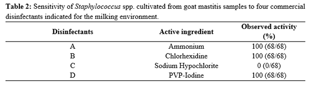 The commercial disinfectants with the quaternary ammonium, chlorhexidine and iodine active ingredients presented the best in vitro activities on the goat mastitis samples of Staphylococcus spp. The same did not occur with the sodium hypochlorite. However, the data obtained in the present study do not allow to establish a relation between the resistance to the disinfectants and the biofilm production in the isolates. However, the periodic performing of the sensitivity profile of the disinfectants is of fundamental importance. Nevertheless, the periodic performing of the sensitivity profile of the disinfectants is of fundamental importance, as well as to know the concentrations of each product before employing them in the programs of mastitis control and milk quality.