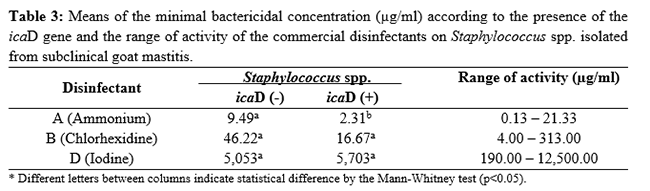 Only the ammonium MBC presented a significant relation as to the presence/absence of the icaD gene. On the contrary to the expected, the tested Staphylococcus spp. isolates containing the icaD gene showed to be more susceptible to the quaternary ammonium than the bacteria that did not contain the icaD gene. These data are contrary to those described by Moretro et al.(21), when they evaluated the relation between the presence of the icaA gene and the resistance to quaternary ammonium compounds in isolated Staphylococcus spp. in the food industry. This fact might be indicative that the remaining factors besides the icaD gene may be involved in the bacterial resistance to ammonium-based disinfectants. Langoni et al.(22) alert to the importance of disinfection processes in the control of contagious and environmental mastitis in goats. With regard to the susceptibility to chlorhexidine and iodine, the test did not suggest a relation between the MBC values and the presence/absence of the icaD gene (P>0,05).