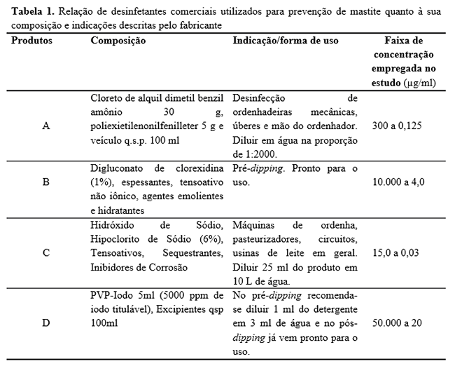 A avaliação da atividade dos desinfetantes testados sobre os micro-organismos isolados de leite mastítico foi realizada por meio do método em meio líquido e semeaduras em ágar Mueller–Hinton (MH). A concentração testada dos desinfetantes foram aquelas indicaDas pelos fabricantes (Tabela 1).